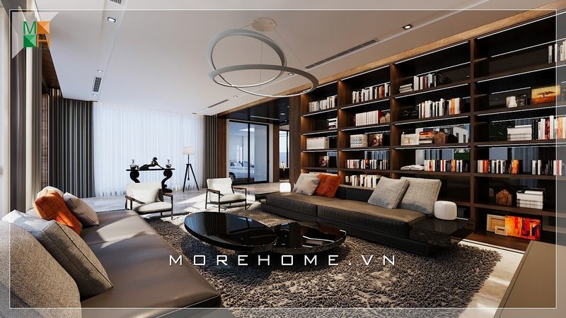 Phòng khách biệt thự, nhà phố hiện đại và trẻ trung với bộ sofa văng da làm tâm điểm, nội thất gỗ óc chó cao cấp khiến mọi người thu hút.